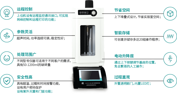 智能型超聲波細胞粉碎機分為標準型、常用型和中式型三種型號。SCIENTZ-1200E為中式型粉碎機,它適用于不同容量樣本(依據不同體積選擇對應型號及探頭)的處理。具有網絡控制、遠程打印、紫外殺菌、時間和功率連續可調等優勢。能夠破碎各類動植物組織、細胞、細菌,同時可用來乳化、分離、分散、提取、清洗及加速化學反應等等。廣泛應用于生命科學、材料科學和環境保護等領域。