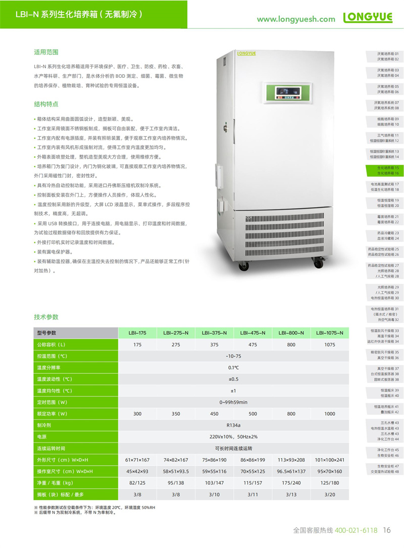 LBI-N 系列生化培養箱適用于環境保護、醫療、衛生、防疫、藥檢、農畜、水產等科研、生產部門,是水體分析的 BOD 測定、細菌、霉菌、微生物的培養保存、植物栽培、育種試驗的專用恒溫設備。